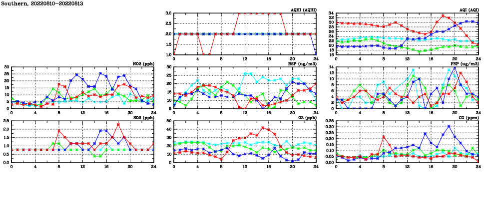 | Air Quality Data Time Series in Southern (2022/08/13) | ( Line colors: Day -3 Day -2 Day -1 Current day ) | 2D Map Current AQHI |
