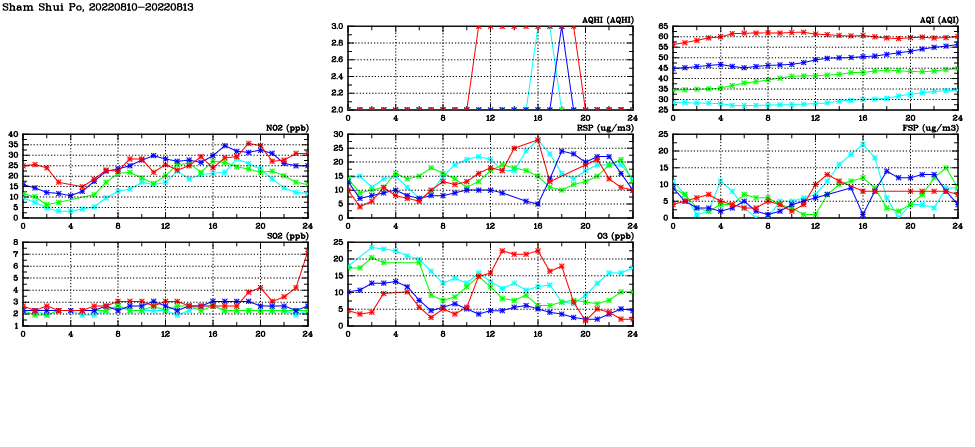| Air Quality Data Time Series in Sham Shui Po (2022/08/13) | ( Line colors: Day -3 Day -2 Day -1 Current day ) | 2D Map Current AQHI |