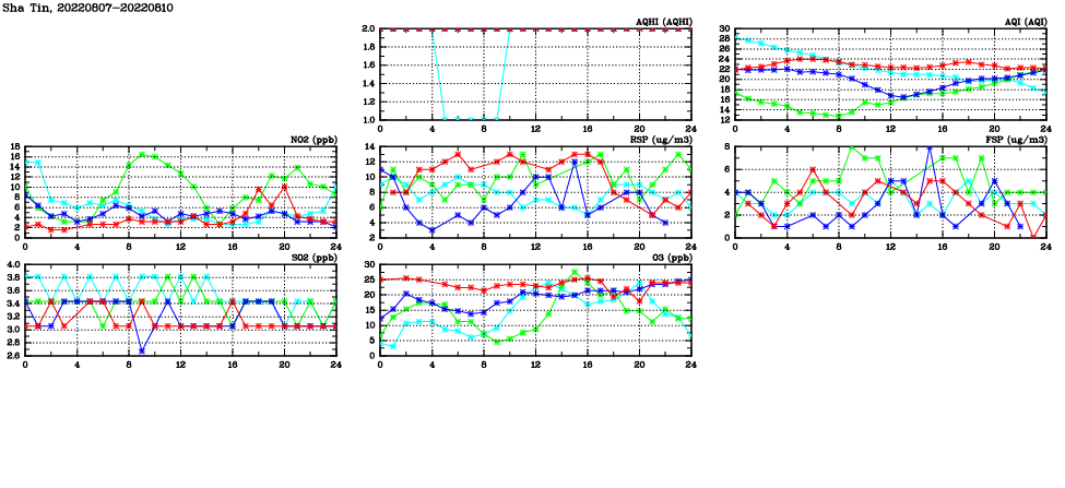 | Air Quality Data Time Series in Sha Tin (2022/08/10) | ( Line colors: Day -3 Day -2 Day -1 Current day ) | 2D Map Current AQHI |