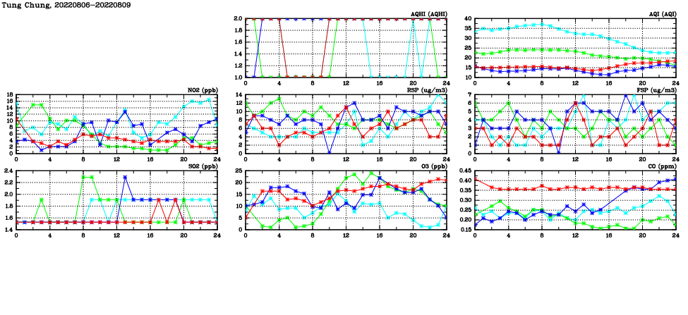 Air Quality Data Time Series in Tung Chung (2022/08/09) | ( Line colors: Day -3 Day -2 Day -1 Current day ) | 2D Map Current AQHI |