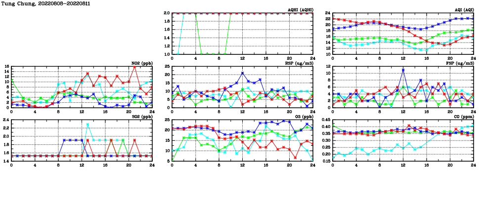 | Air Quality Data Time Series in Tung Chung (2022/08/11) | ( Line colors: Day -3 Day -2 Day -1 Current day ) | 2D Map Current AQHI |
