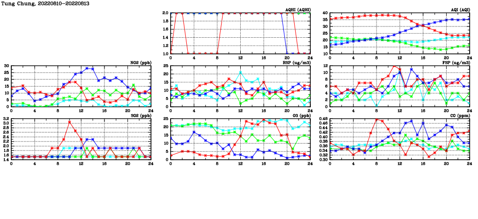 | Air Quality Data Time Series in Tung Chung (2022/08/13) | ( Line colors: Day -3 Day -2 Day -1 Current day ) | 2D Map Current AQHI |