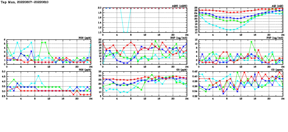 | Air Quality Data Time Series in Tap Mun (2022/08/10) | ( Line colors: Day -3 Day -2 Day -1 Current day ) | 2D Map Current AQHI |