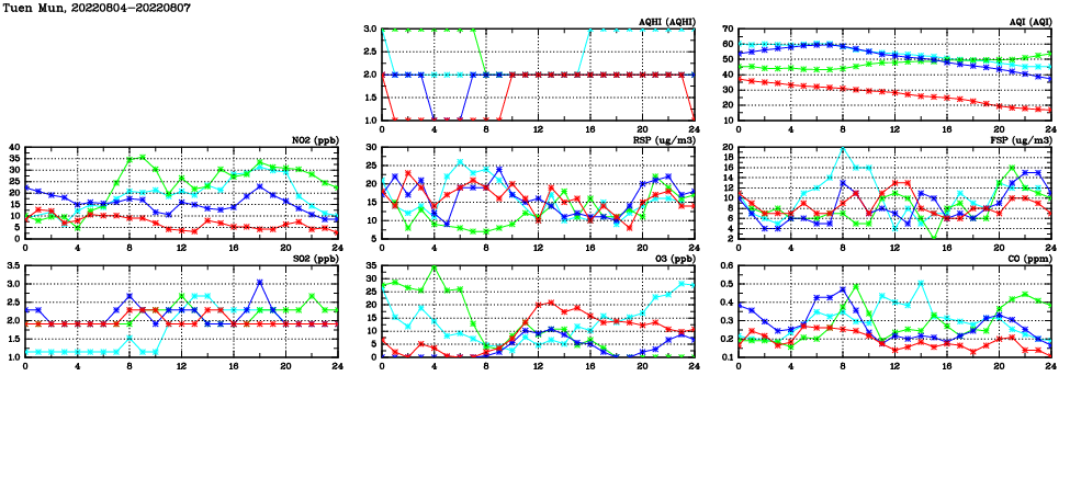 | Air Quality Data Time Series in Tuen Mun (2022/08/07) | ( Line colors: Day -3 Day -2 Day -1 Current day ) | 2D Map Current AQHI |