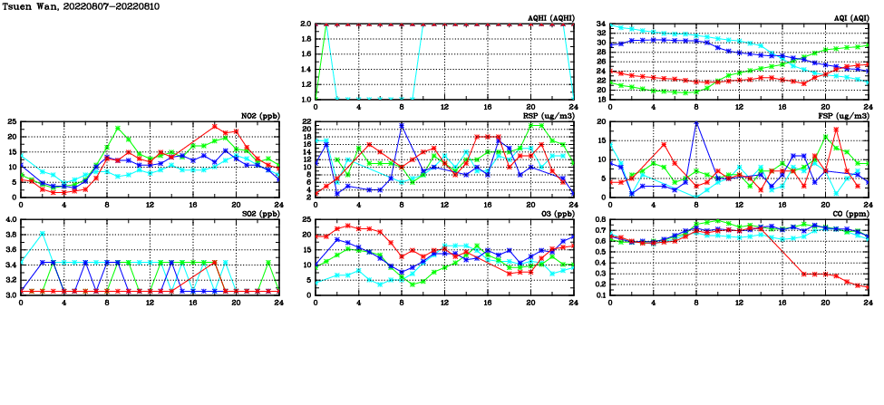 | Air Quality Data Time Series in Tsuen Wan (2022/08/10) | ( Line colors: Day -3 Day -2 Day -1 Current day ) | 2D Map Current AQHI |