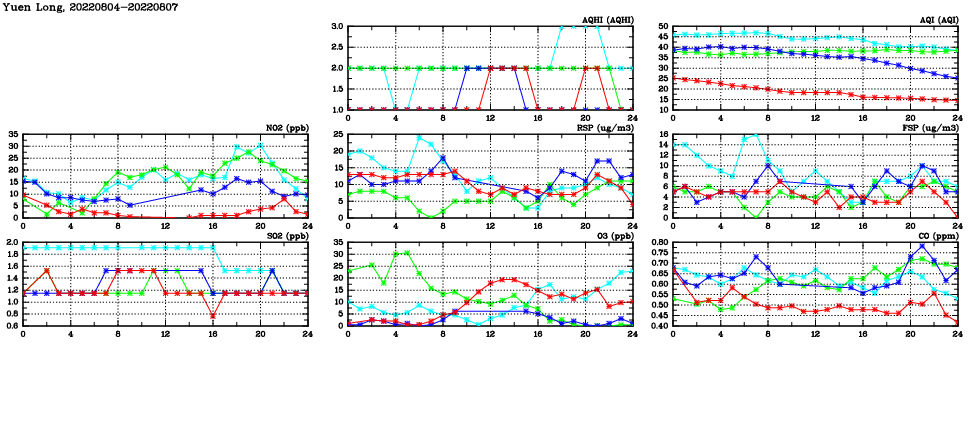 | Air Quality Data Time Series in Yuen Long (2022/08/07) | ( Line colors: Day -3 Day -2 Day -1 Current day ) | 2D Map Current AQHI |