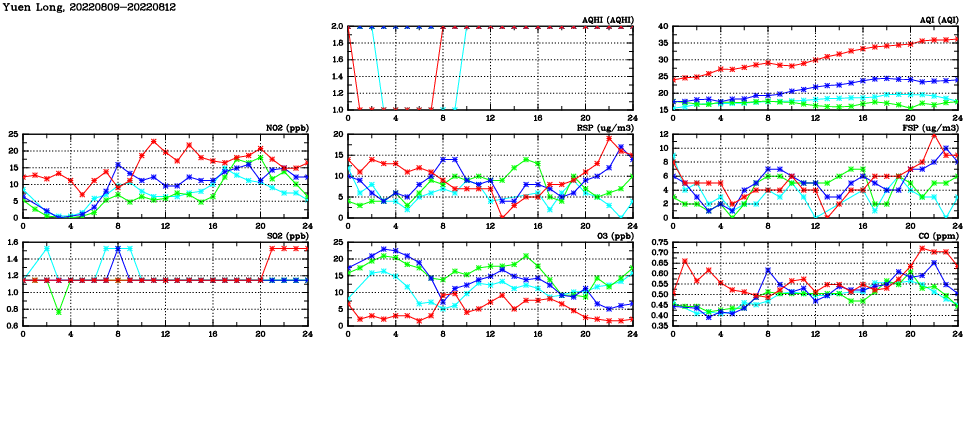 | Air Quality Data Time Series in Yuen Long (2022/08/12) | ( Line colors: Day -3 Day -2 Day -1 Current day ) | 2D Map Current AQHI |