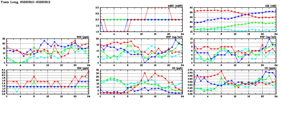 | Air Quality Data Time Series in Yuen Long (2022/08/13) | ( Line colors: Day -3 Day -2 Day -1 Current day ) | 2D Map Current AQHI |