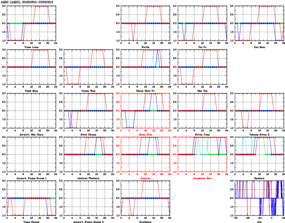 | Air Quality Data Time Series for AQHI (2022/08/13) | ( Line colors: Day -3 Day -2 Day -1 Current day ) | 2D Map Current AQHI |