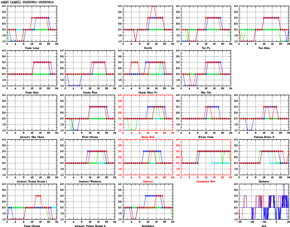 | Air Quality Data Time Series for AQHI (2022/08/14) | ( Line colors: Day -3 Day -2 Day -1 Current day ) | 2D Map Current AQHI |