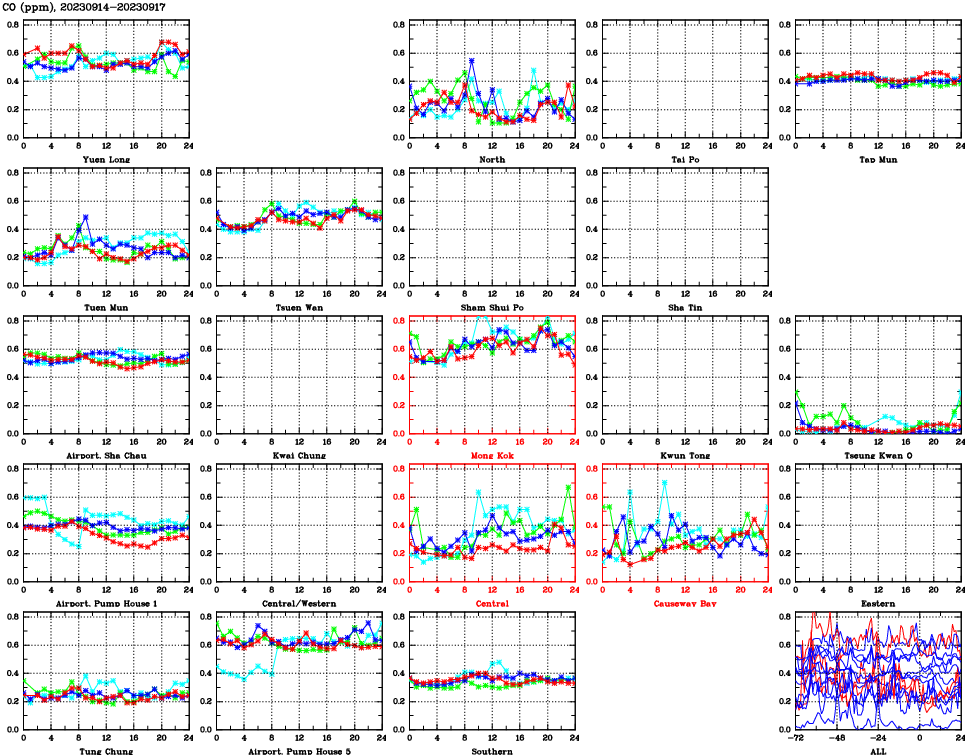 | Air Quality Data Time Series for CO (2023/09/17) | ( Line colors: Day -3 Day -2 Day -1 Current day ) | 2D Map Current AQHI |