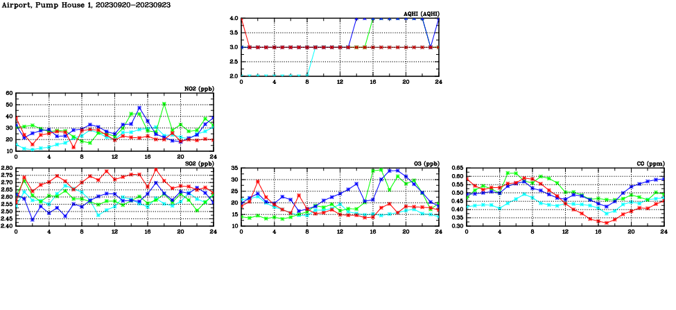 | Air Quality Data Time Series in Airport, Pump House 1 (2023/09/23) | ( Line colors: Day -3 Day -2 Day -1 Current day ) | 2D Map Current AQHI |