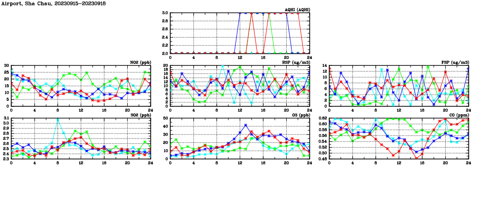 | Air Quality Data Time Series in Airport, Sha Chau (2023/09/18) | ( Line colors: Day -3 Day -2 Day -1 Current day ) | 2D Map Current AQHI |