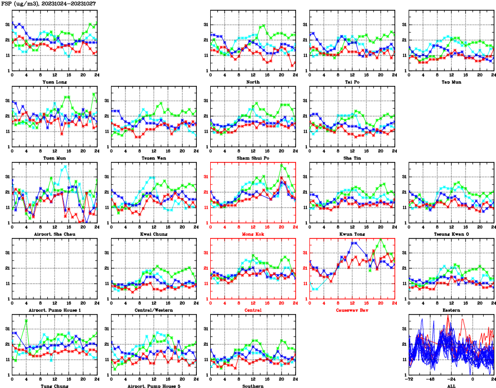 | Air Quality Data Time Series for FSP (2023/10/27) | ( Line colors: Day -3 Day -2 Day -1 Current day ) | 2D Map Current AQHI |