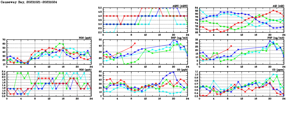 | Air Quality Data Time Series in Causeway Bay (2023/10/24) | ( Line colors: Day -3 Day -2 Day -1 Current day ) | 2D Map Current AQHI |