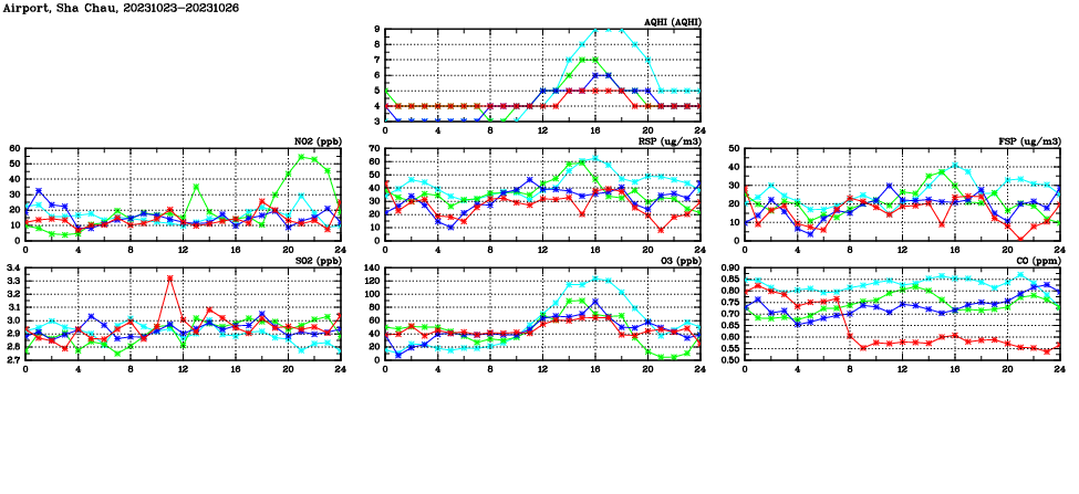 | Air Quality Data Time Series in Airport, Sha Chau (2023/10/26) | ( Line colors: Day -3 Day -2 Day -1 Current day ) | 2D Map Current AQHI |