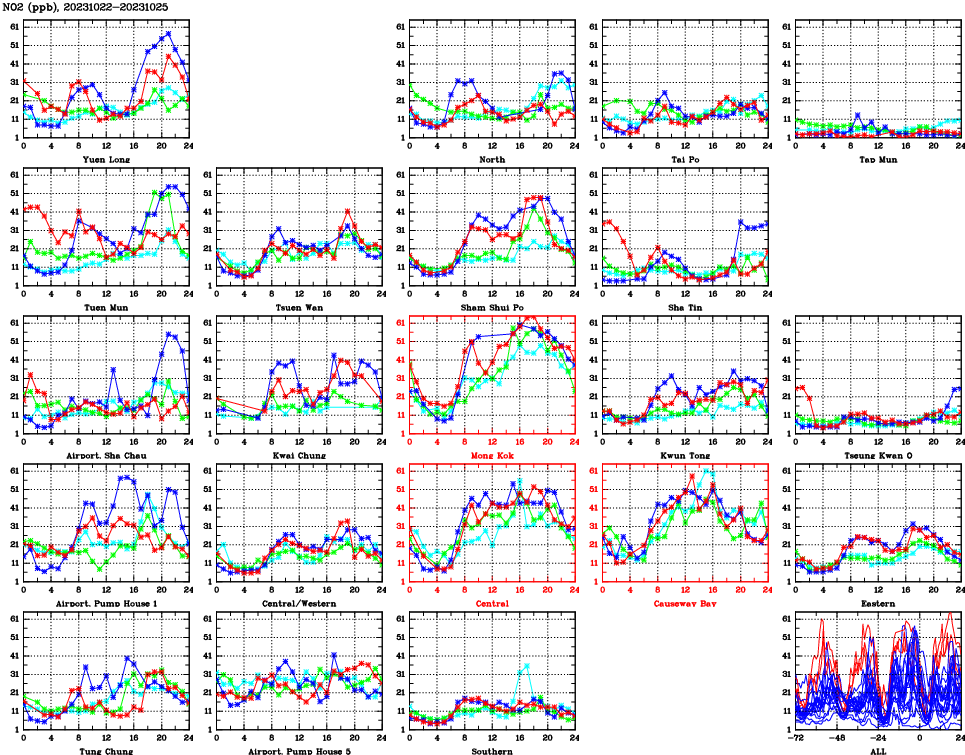 | Air Quality Data Time Series for NO2 (2023/10/25) | ( Line colors: Day -3 Day -2 Day -1 Current day ) | 2D Map Current AQHI |