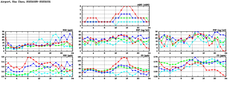 | Air Quality Data Time Series in Airport, Sha Chau (2023/10/31) | ( Line colors: Day -3 Day -2 Day -1 Current day ) | 2D Map Current AQHI |