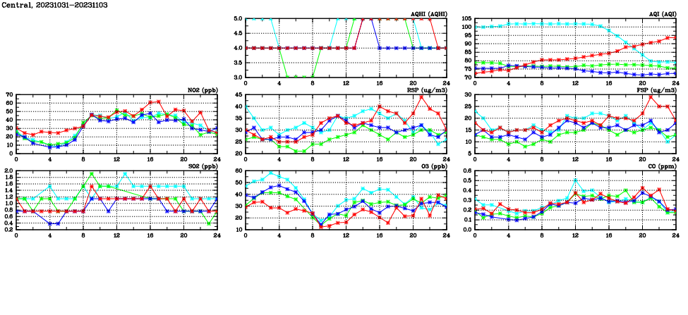 | Air Quality Data Time Series in Central (2023/11/03) | ( Line colors: Day -3 Day -2 Day -1 Current day ) | 2D Map Current AQHI |