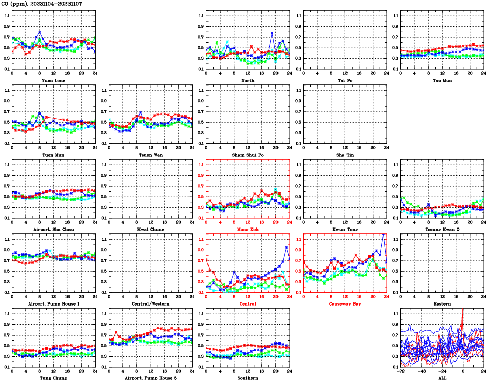 | Air Quality Data Time Series for CO (2023/11/07) | ( Line colors: Day -3 Day -2 Day -1 Current day ) | 2D Map Current AQHI |