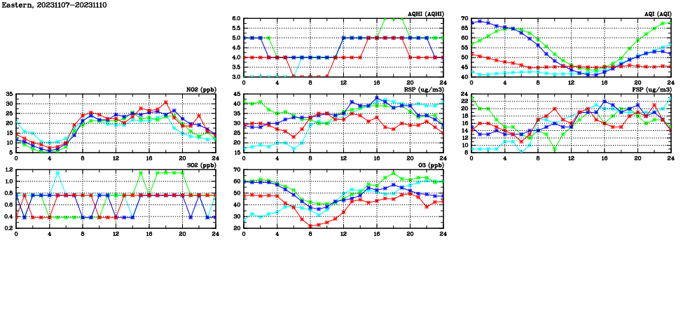 | Air Quality Data Time Series in Eastern (2023/11/10) | ( Line colors: Day -3 Day -2 Day -1 Current day ) | 2D Map Current AQHI |