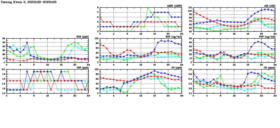 | Air Quality Data Time Series in Tseung Kwan O (2023/11/25) | ( Line colors: Day -3 Day -2 Day -1 Current day ) | 2D Map Current AQHI |