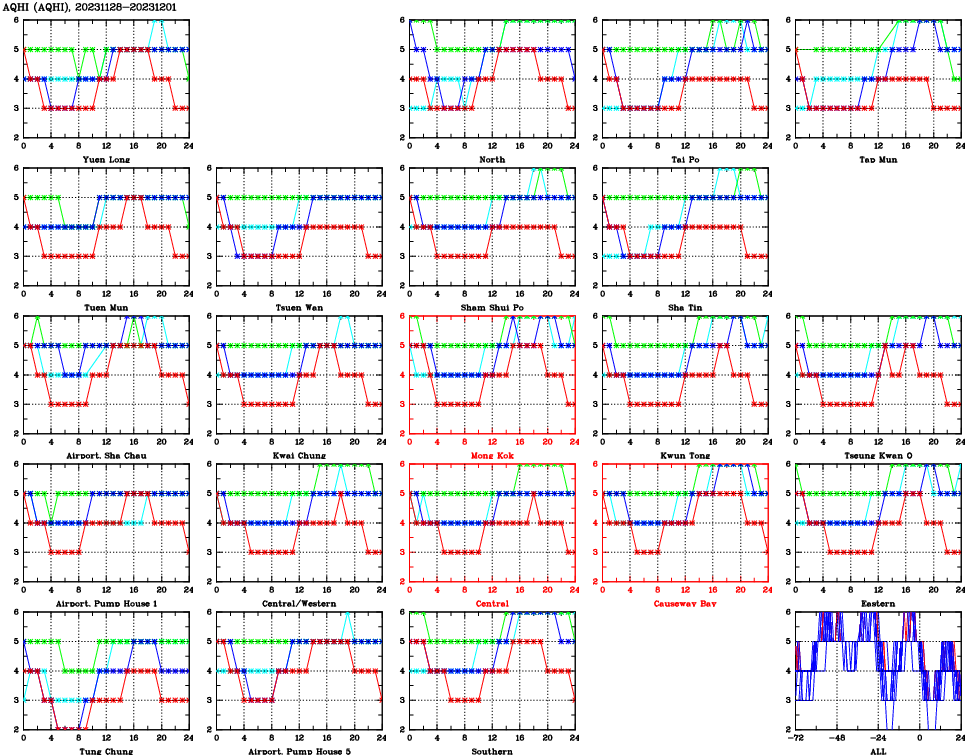| Air Quality Data Time Series for AQHI (2023/12/01) | ( Line colors: Day -3 Day -2 Day -1 Current day ) | 2D Map Current AQHI |