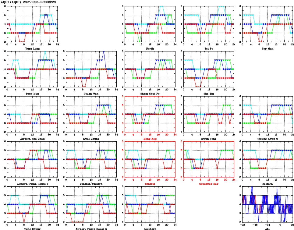 | Air Quality Data Time Series for AQHI (2025/02/28) | ( Line colors: Day -3 Day -2 Day -1 Current day ) | 2D Map Current AQHI |