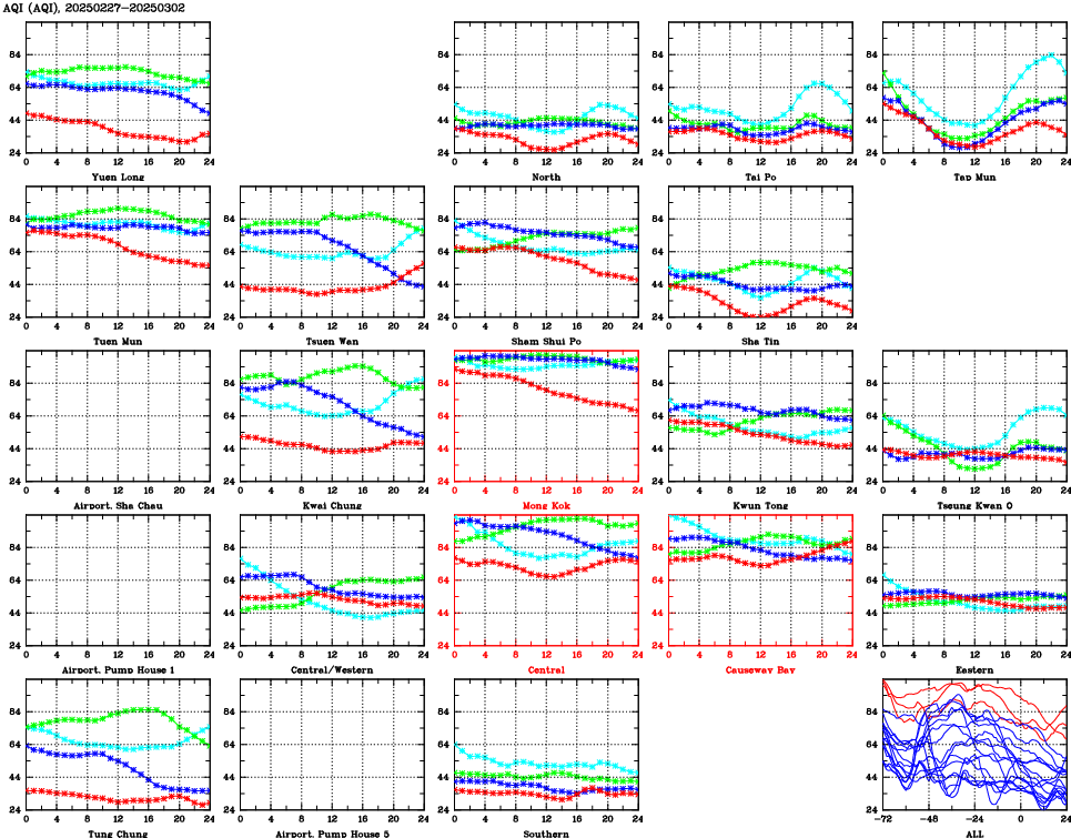 | Air Quality Data Time Series for AQI (2025/03/02) | ( Line colors: Day -3 Day -2 Day -1 Current day ) | 2D Map Current AQHI |