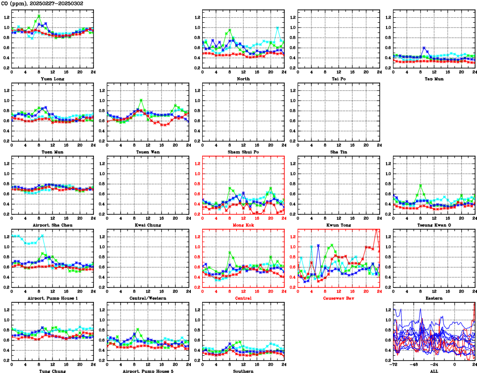 | Air Quality Data Time Series for CO (2025/03/02) | ( Line colors: Day -3 Day -2 Day -1 Current day ) | 2D Map Current AQHI |