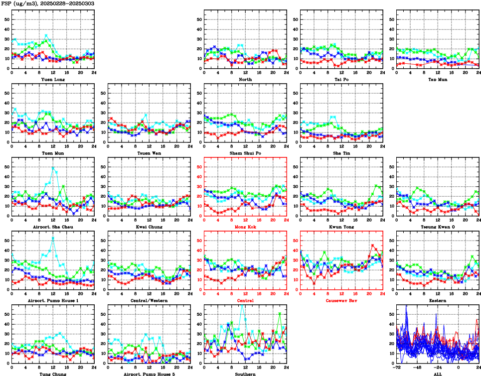 | Air Quality Data Time Series for FSP (2025/03/03) | ( Line colors: Day -3 Day -2 Day -1 Current day ) | 2D Map Current AQHI |