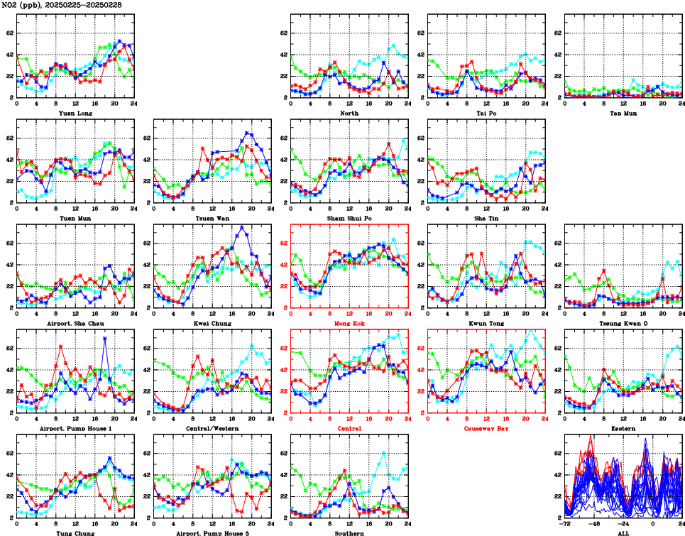 | Air Quality Data Time Series for NO2 (2025/02/28) | ( Line colors: Day -3 Day -2 Day -1 Current day ) | 2D Map Current AQHI |