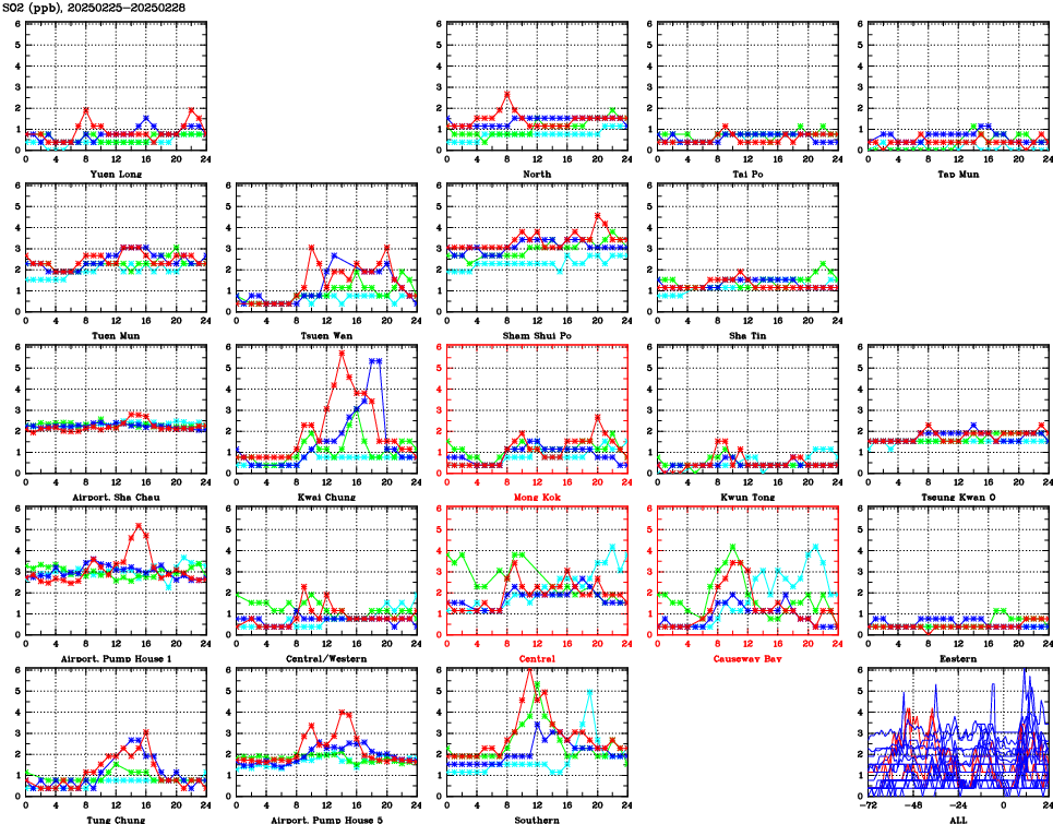 | Air Quality Data Time Series for SO2 (2025/02/28) | ( Line colors: Day -3 Day -2 Day -1 Current day ) | 2D Map Current AQHI |