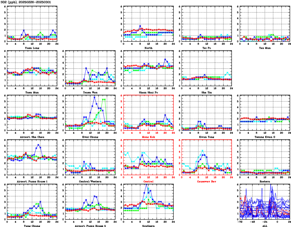 | Air Quality Data Time Series for SO2 (2025/03/01) | ( Line colors: Day -3 Day -2 Day -1 Current day ) | 2D Map Current AQHI |