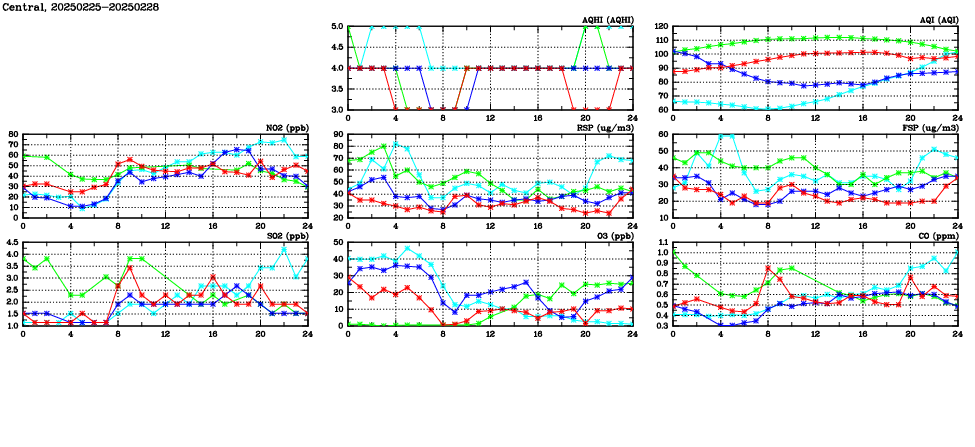 | Air Quality Data Time Series in Central (2025/02/28) | ( Line colors: Day -3 Day -2 Day -1 Current day ) | 2D Map Current AQHI |