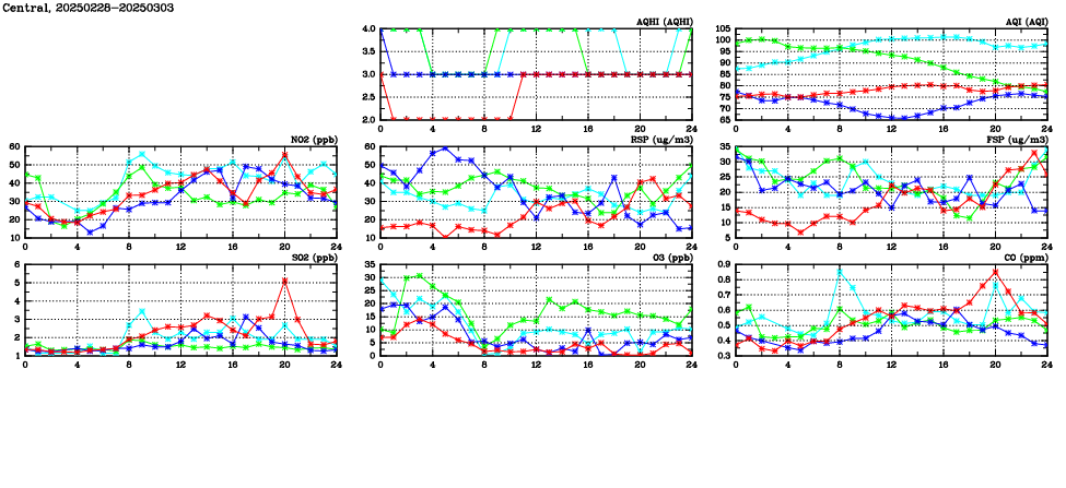 | Air Quality Data Time Series in Central (2025/03/03) | ( Line colors: Day -3 Day -2 Day -1 Current day ) | 2D Map Current AQHI |