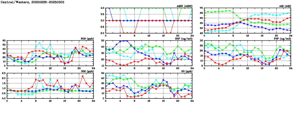| Air Quality Data Time Series in Central/Western (2025/03/03) | ( Line colors: Day -3 Day -2 Day -1 Current day ) | 2D Map Current AQHI |