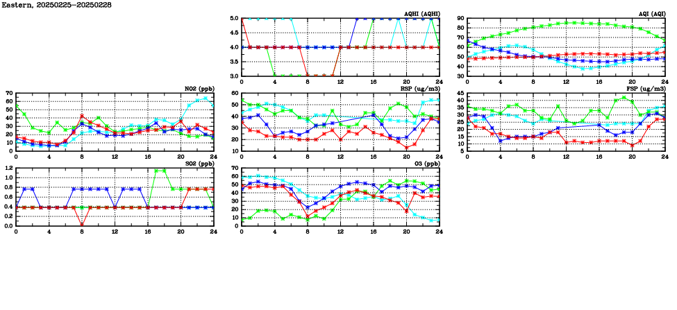 | Air Quality Data Time Series in Eastern (2025/02/28) | ( Line colors: Day -3 Day -2 Day -1 Current day ) | 2D Map Current AQHI |