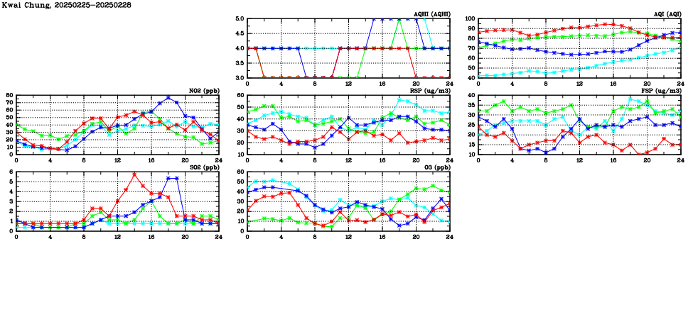| Air Quality Data Time Series in Kwai Chung (2025/02/28) | ( Line colors: Day -3 Day -2 Day -1 Current day ) | 2D Map Current AQHI |