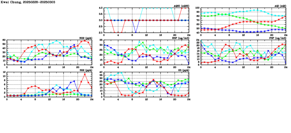 | Air Quality Data Time Series in Kwai Chung (2025/03/03) | ( Line colors: Day -3 Day -2 Day -1 Current day ) | 2D Map Current AQHI |
