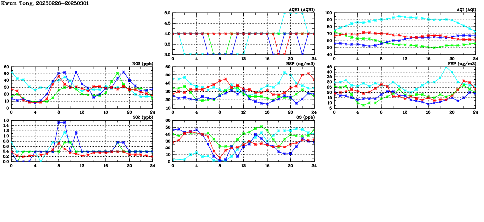 | Air Quality Data Time Series in Kwun Tong (2025/03/01) | ( Line colors: Day -3 Day -2 Day -1 Current day ) | 2D Map Current AQHI |