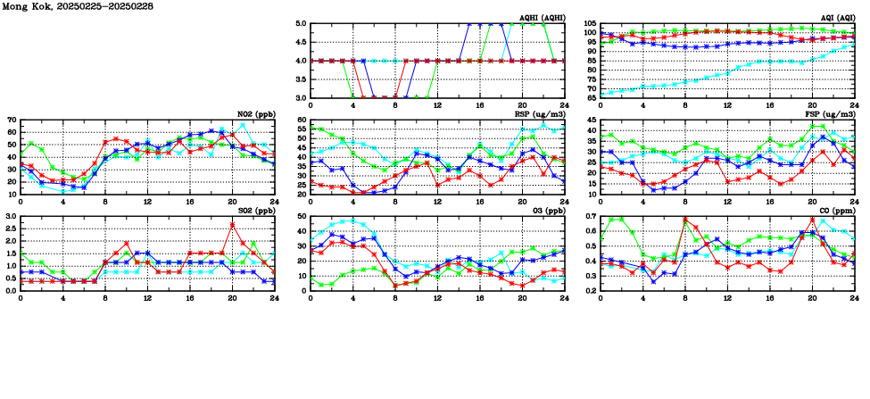 | Air Quality Data Time Series in Mong Kok (2025/02/28) | ( Line colors: Day -3 Day -2 Day -1 Current day ) | 2D Map Current AQHI |
