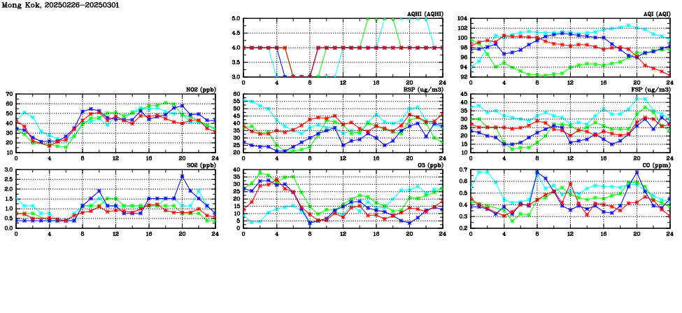 | Air Quality Data Time Series in Mong Kok (2025/03/01) | ( Line colors: Day -3 Day -2 Day -1 Current day ) | 2D Map Current AQHI |