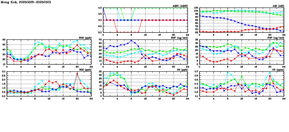 | Air Quality Data Time Series in Mong Kok (2025/03/03) | ( Line colors: Day -3 Day -2 Day -1 Current day ) | 2D Map Current AQHI |
