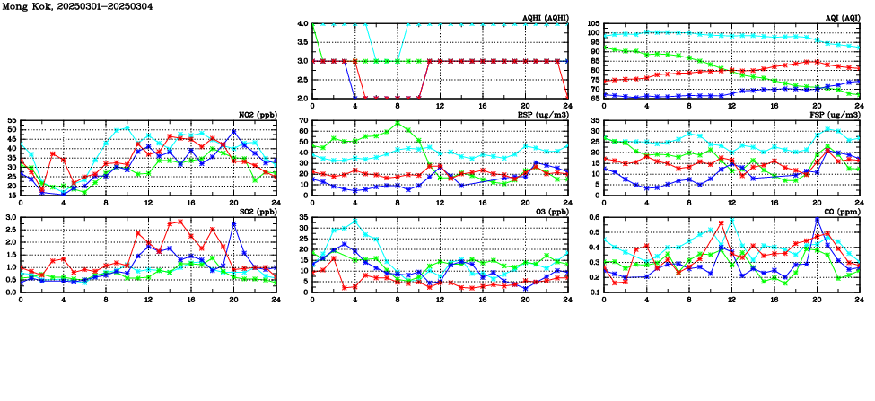 | Air Quality Data Time Series in Mong Kok (2025/03/04) | ( Line colors: Day -3 Day -2 Day -1 Current day ) | 2D Map Current AQHI |