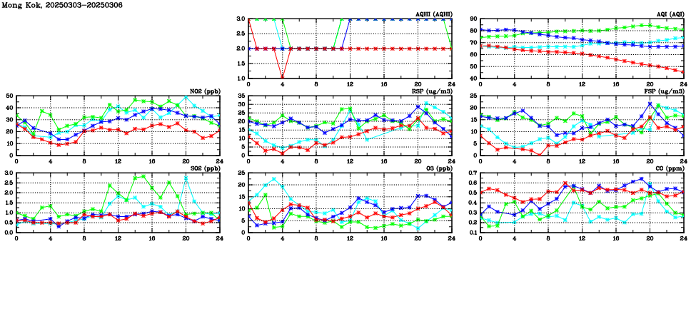 | Air Quality Data Time Series in Mong Kok (2025/03/06) | ( Line colors: Day -3 Day -2 Day -1 Current day ) | 2D Map Current AQHI |