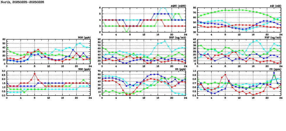 | Air Quality Data Time Series in North (2025/02/28) | ( Line colors: Day -3 Day -2 Day -1 Current day ) | 2D Map Current AQHI |