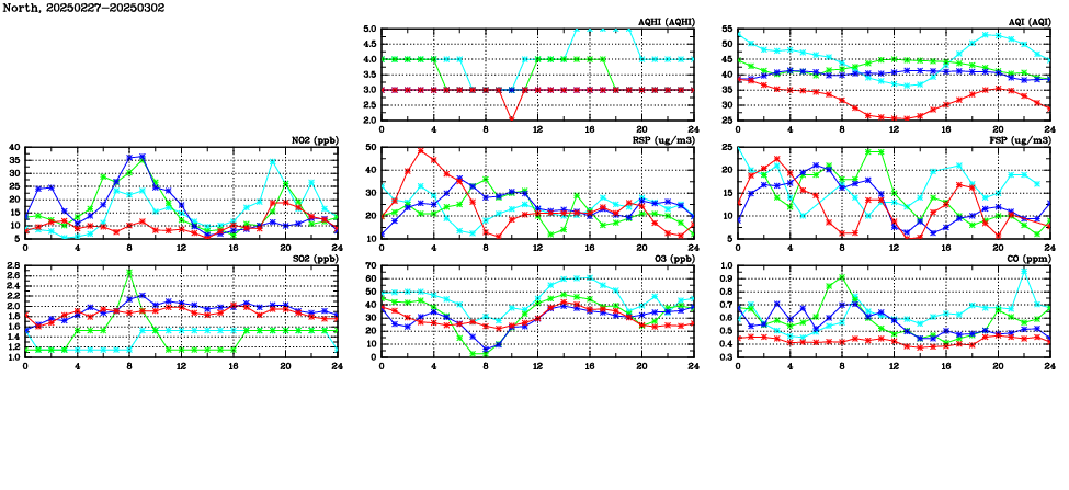 | Air Quality Data Time Series in North (2025/03/02) | ( Line colors: Day -3 Day -2 Day -1 Current day ) | 2D Map Current AQHI |