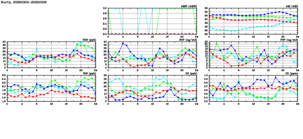 | Air Quality Data Time Series in North (2025/03/06) | ( Line colors: Day -3 Day -2 Day -1 Current day ) | 2D Map Current AQHI |
