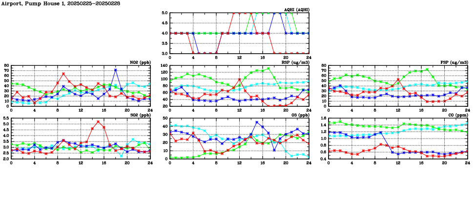 | Air Quality Data Time Series in Airport, Pump House 1 (2025/02/28) | ( Line colors: Day -3 Day -2 Day -1 Current day ) | 2D Map Current AQHI |